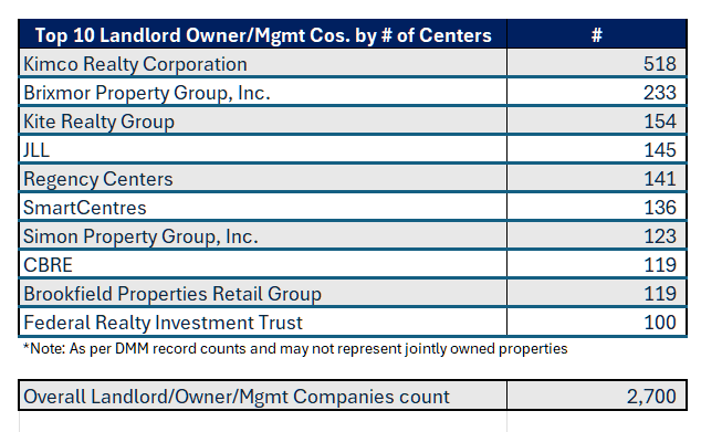 Major players such as Kimco Realty Corporation, Brixmor Property Group, Kite Realty Group, and Simon Property Group collectively oversee hundreds of centers, with leaders like Kimco holding 521 properties and Simon commanding over 157 million square feet of GLA (based on the DMM dataset of centers).