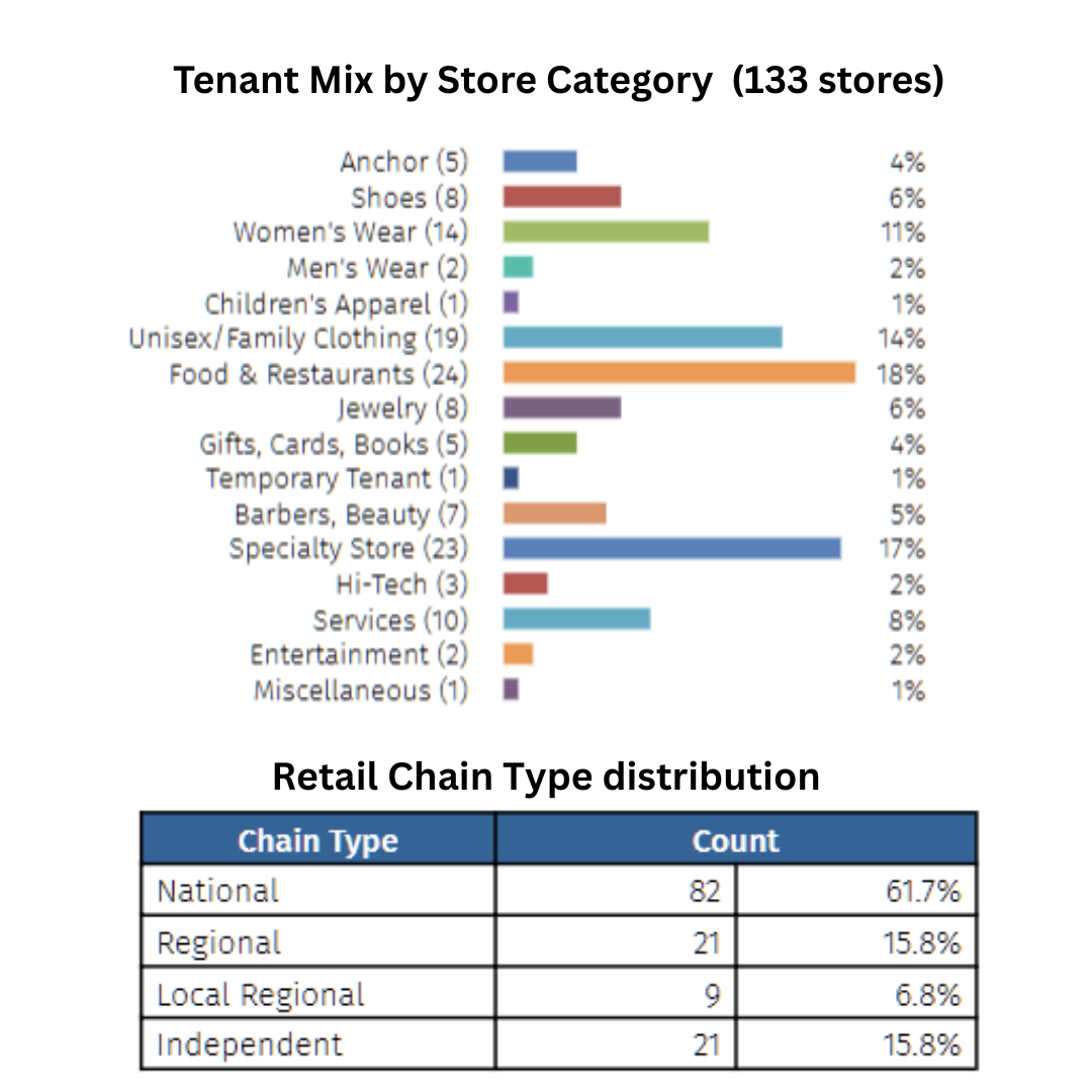 - Mobile and Segmentation Insights: The top Claritas PRIZM® segments profile visitors as a mix of upscale older adults (“Beltway Boomers,” “Cruisin’ to Retirement”) and upper-midscale families and singles (“Bright Lights, Li’l City”). This demographic diversity underscores the need for a balanced tenant mix that appeals to both value-seeking families and luxury-oriented shoppers. The retail mix, with 61.7% national chains and 15.8% independent retailers, reflects a strong reliance on established, well-known brands to draw visitors