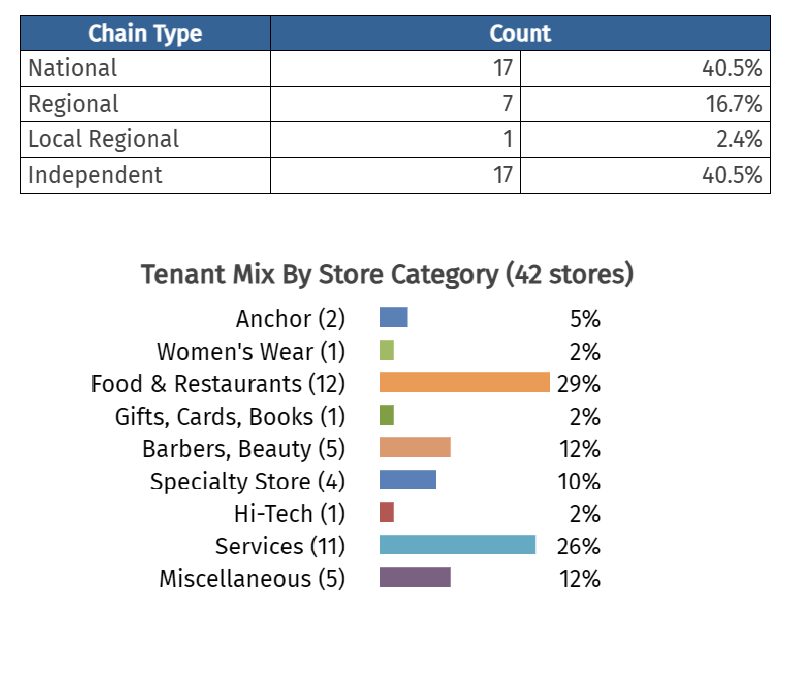 Compared to other community centers in the Omaha-Council Bluffs MSA, Lakeside Plaza’s tenant mix reflects a moderate proportion of independent retailers, with independents representing 16% of all tenants—well within the typical 15–30% range for comparable markets. The plaza’s tenant composition—62% national chains and 16% local/independent businesses—reflects a strategy that blends brand recognition with regional charm, appealing to a wide visitor base and enhancing its appeal to both loyal neighborhood shoppers and visitors from the broader trade area.