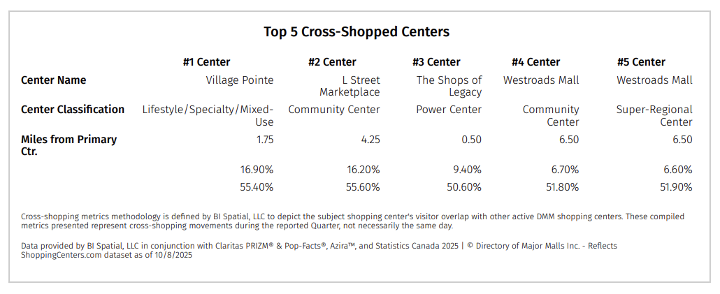 - Cross-Shopping & Competition: Visitor analysis shows notable overlap with nearby retail hubs, including Village Pointe Shopping Center (~10.2% overlap), Oak View Mall (~8.9%), and Legacy West Plaza (~7.5%). This competitive environment emphasizes the importance of differentiated offerings—Lakeside’s combination of everyday essentials, entertainment, and locally loved dining creates a compelling reason for repeat visits. The closest major competitor, Village Pointe, is situated roughly 4 miles away and focuses heavily on premium lifestyle retail, while Lakeside balances practical shopping and family leisure.